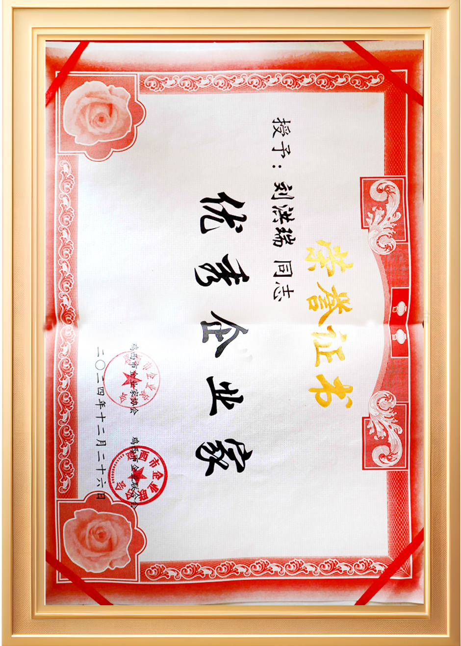 雞西市企業(yè)家協(xié)會(huì)授予劉洪瑞先生“雞西市優(yōu) 秀企業(yè)家”稱號(hào)